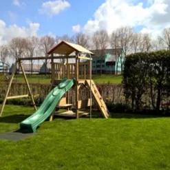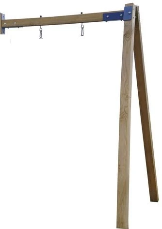 Aanbouw schommel, geschikt voor speeltorens. De aanbouw schommel met een houten schommelbalk (8,8 x 8,8 cm.) wordt middels stalen hoekkoppelingen aan de speeltoren en de schommelpalen bevestigd. Optioneel 2 hardhouten piketten .