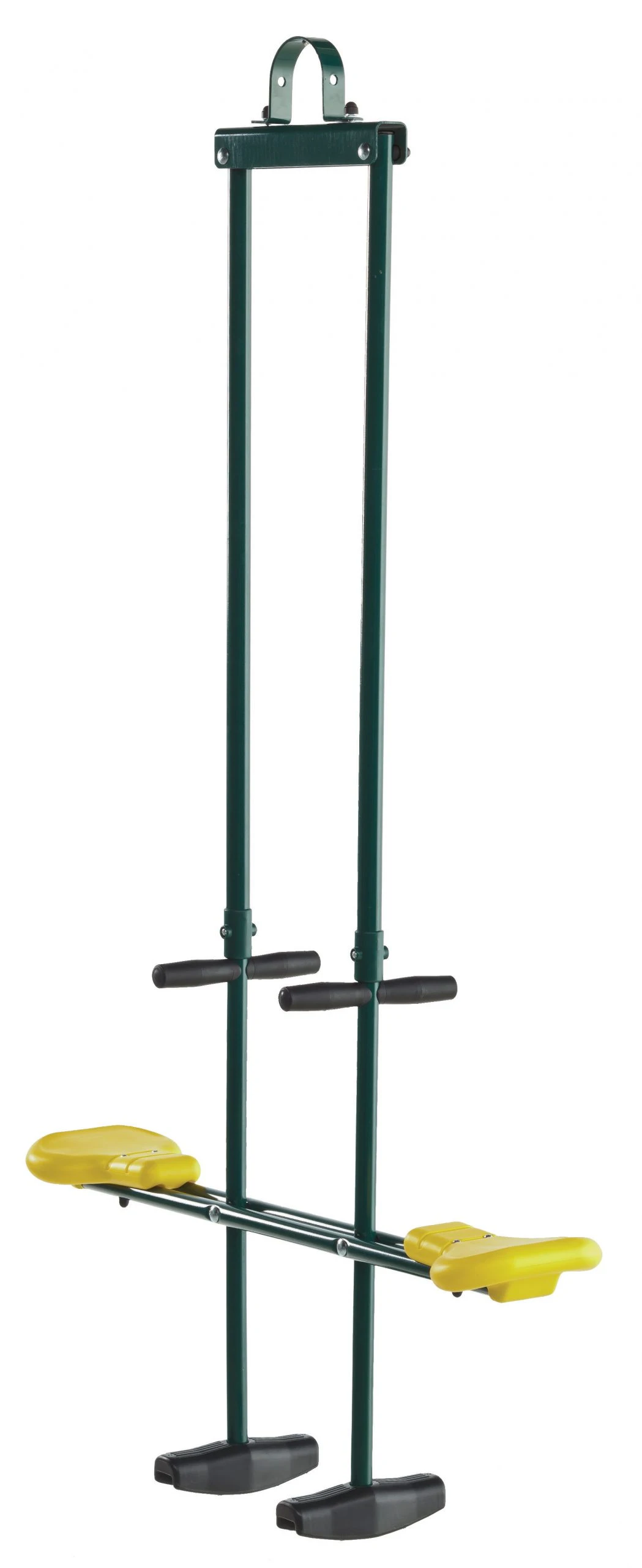 Metalen wipschommel met kunststof zitjes. Ook heel goed alleen te gebruiken. Kan gekoppeld worden aan een schommelbalk in rondhout met een diameter van 10 cm.