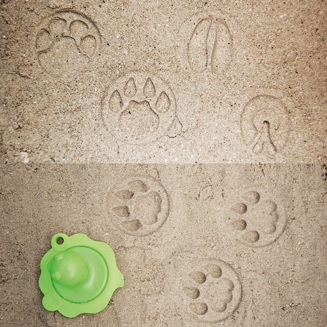 1 handgreep waarop je 4 verschillende “voetjes” kunt plaatsen. Stempel vervolgens een geheimzinnig spoor in het zand.