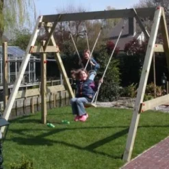 De schommel bestaat uit houten balken van 9,5 x 9,5 cm, de schommelbalk is een houten balk van 9,5 x 17 cm. Vervaardigd uit Noord-Europees vurenhout, wat ter verduurzaming onder druk is geïmpregneerd