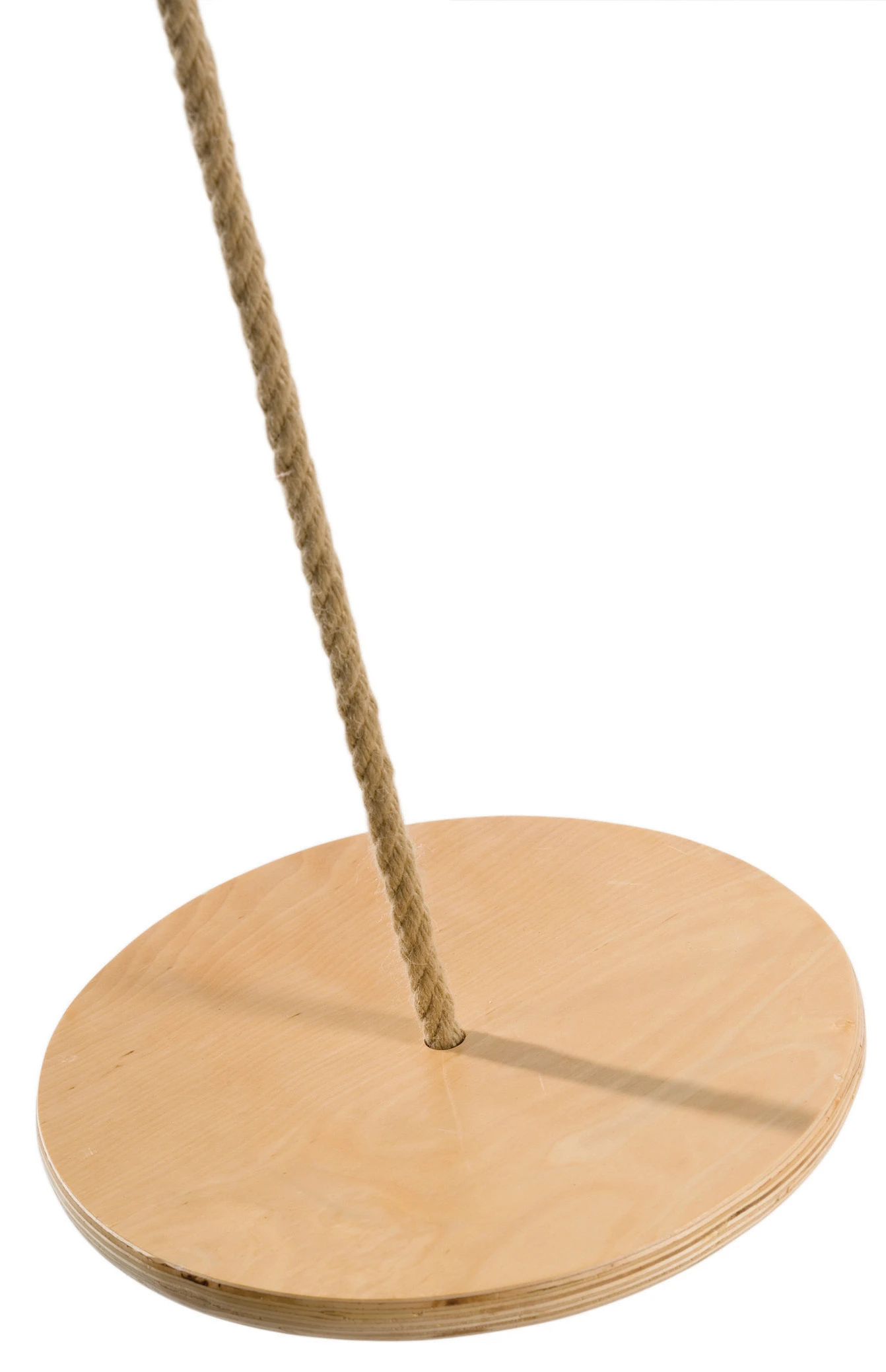 Slingeren als een aapje met deze verniste multiplex schotel aan een 12 mm. Polyhemp-touw. De stelachten en ringen zijn gegalvaniseerd.