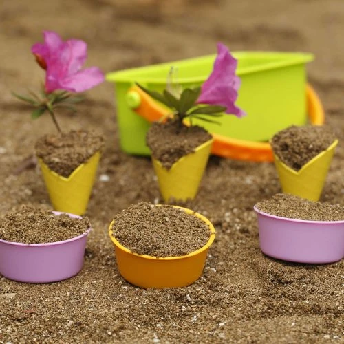Leuke speelset voor de zandbak. 3 ijshoorntjes, 3 ijsbakjes, een ijslepel en een mandje.