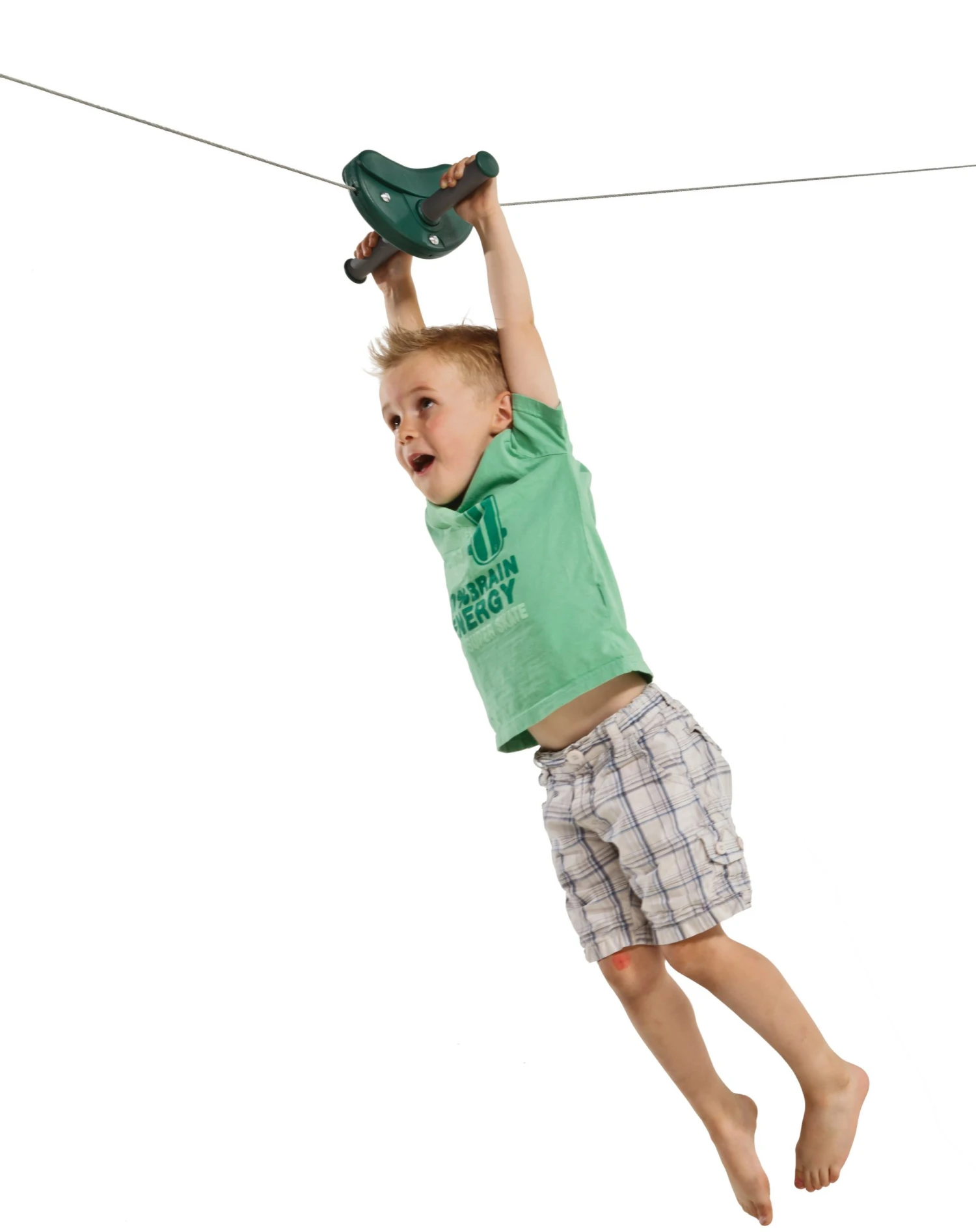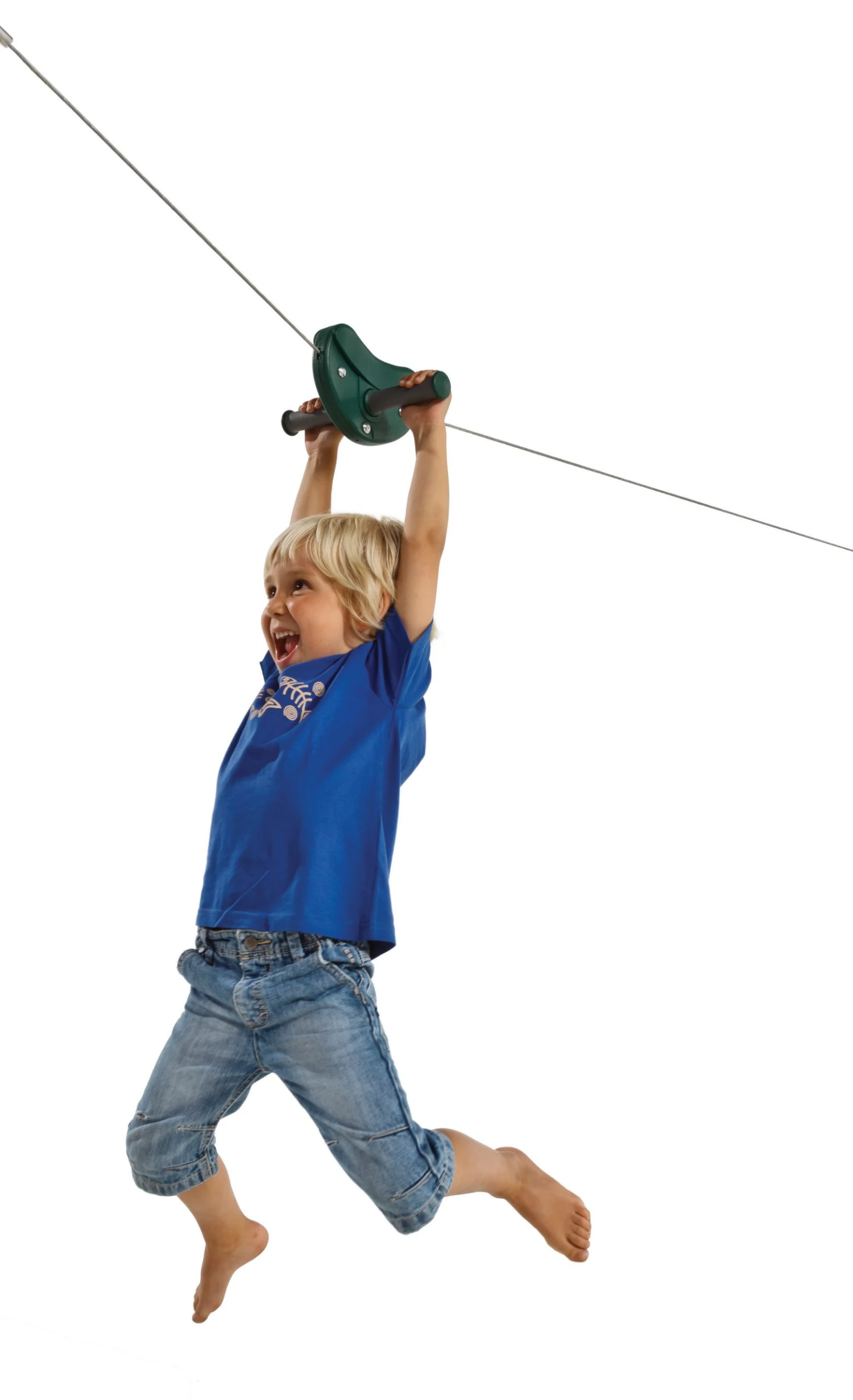 De kabelbaan voor kinderen is te verkrijgbaar in de kleur groen. Optioneel kun je er een schotelschommel bij kopen, die als zitje aan de kabelbaan bevestigd kan worden.