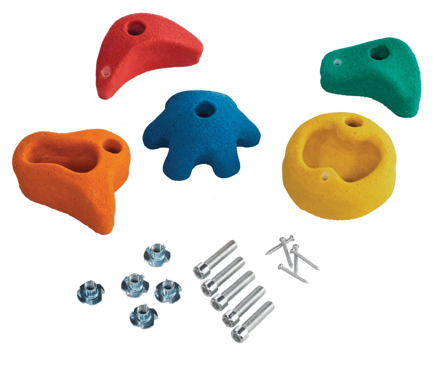 Klimblokken in vrolijke sets van 5 stuks in verschillende kleuren en in verschillende vormen.