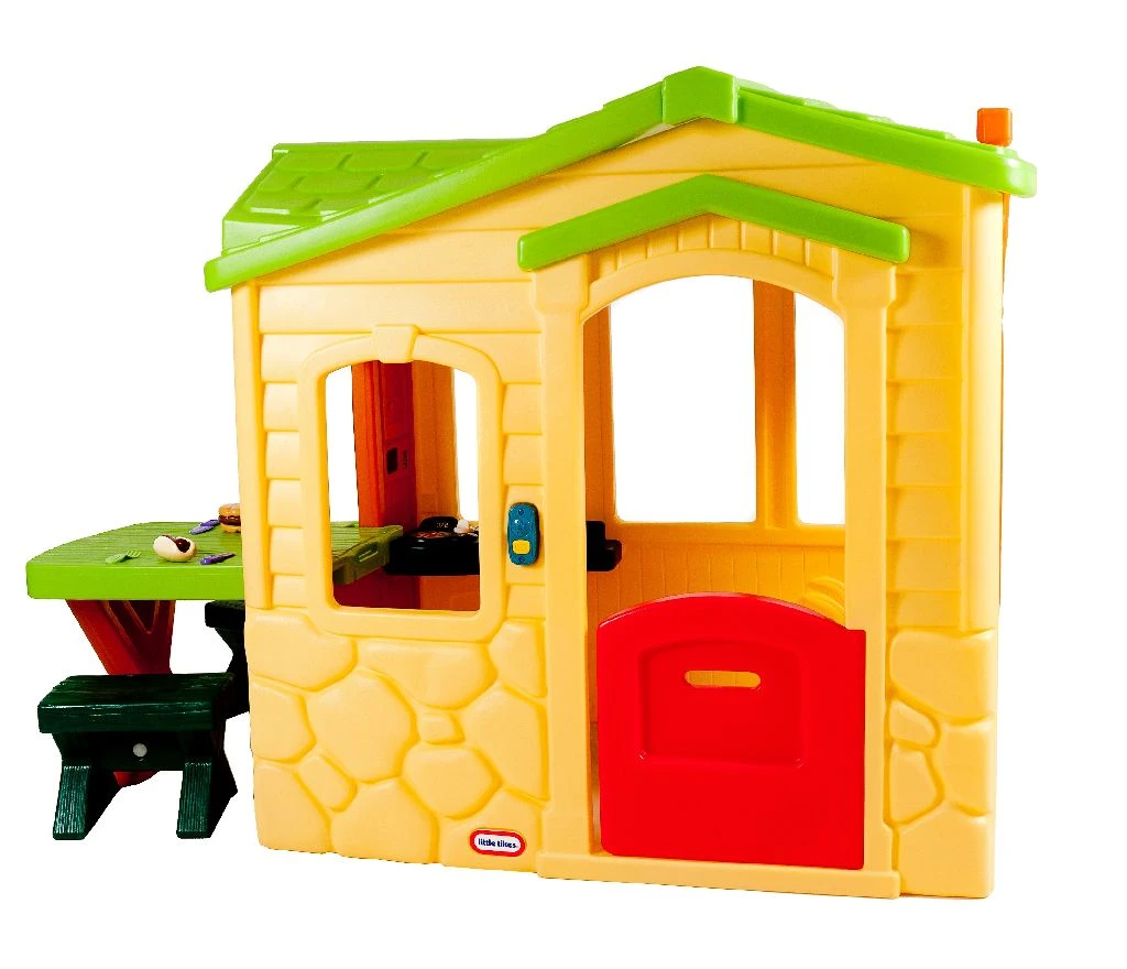 Little Tikes Speelhuis Picknick in natural kleurstelling. De kok kan zijn maaltijden door het raam serveren aan de gasten aan de picknicktafel! Inclusief keuken met pittenβ, oven, kastjes en een haard, en een deur, brievenbus en een 19-delige accessoireset. De deurbel maakt 6 geluidjes. 3 AAA-batterijen excl. Geschikt voor kinderen vanaf 1,5 tot 5 jaar. Afmetingen: 93 x 160 x 120 cm.