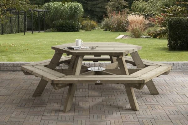 Dit is een 6-persoons picknicktafel gemaakt van verduurzaamd vurenhout met een blad- en zittingdikte van 45 mm.
