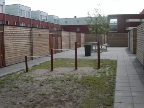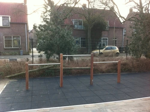 Duikelrek bestaande uit hardhouten staanders en een rvs duikelstangen.ย