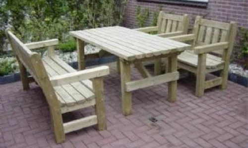 Robuuste tuinset die door de rondingen in het zitvlak ook nog eens uitstekend zit. Uit noord-europees vurenhout, standaard groen geimpregneerd.