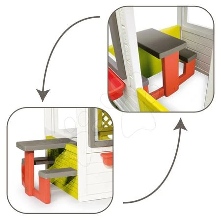 Gezellig huis met een tuintje, deurtje met brievenbus en een electronische deurbel (excl. batterijen). Een verschuifbare tafel met 2 bankjes, als het mooi weer is gebruik je de “tuinset” buiten, is het weer wat minder dan ga je lekker binnen zitten. Incl. bloembakken om zelf te vullen.