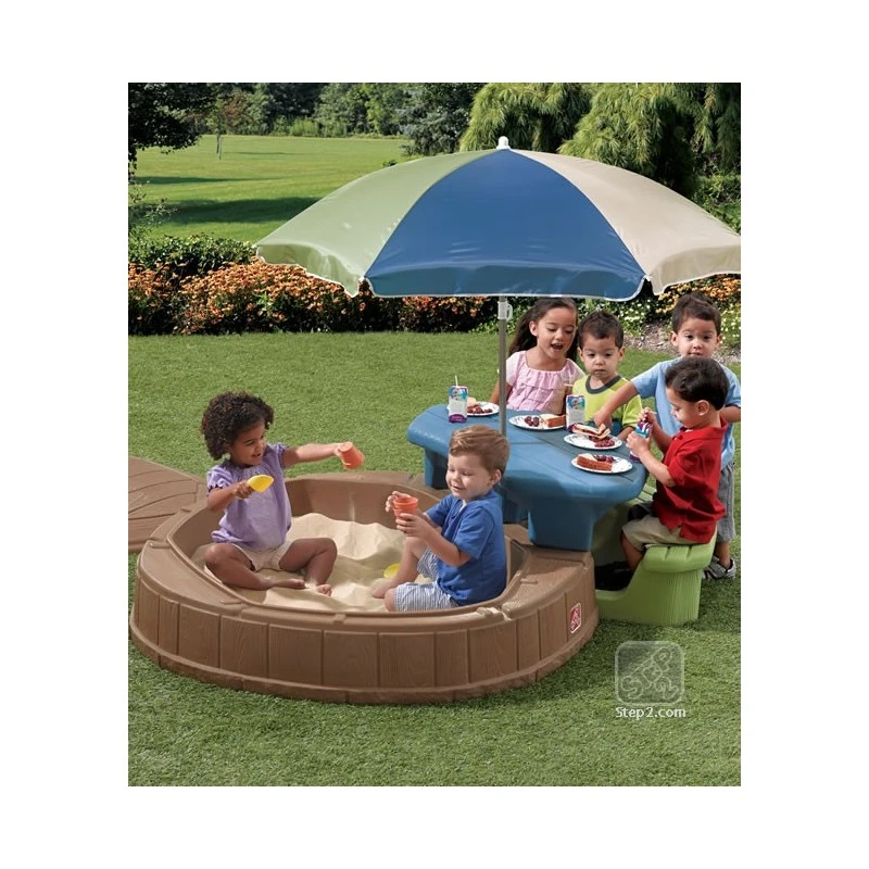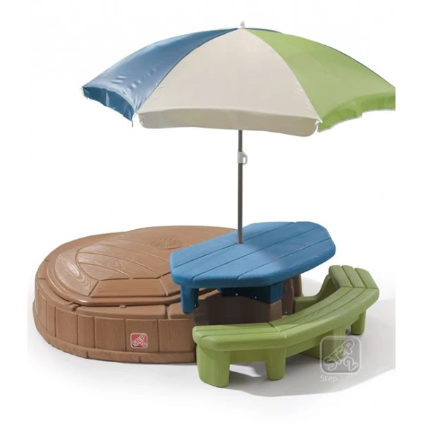 Ga direct van de zandbak naar je boterham. Ruime zandbak met daaraan vast een picknicktafel en bankje. Op de zandbakrand zijn ook 2 zitjes voorzien zodat de kinderen rondom de tafel een plaatsje kunnen zoeken. Compleet met zandbakdeksel en afneembare parasol (hoogte 152 cm.) De parasol geeft bescherming tegen de zon. De andbak kan gevuld worden meet 90 kg. zand. Compleet met 2 schepjes en 2 emmertjes.