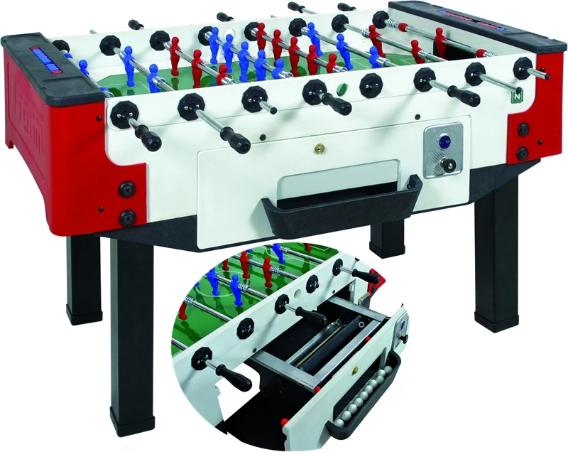 Outdoor voetbaltafel met munt-inworp. 1 spel = 50 cent. Probleemloos inzetbaar bij zwembaden, campings, in tuinen en op terrassen. De eerste echte voetbaltafel voor outdoor gebruik. Bestand tegen alle weersinvloeden zoals warmte, koude en vochtigheid.
