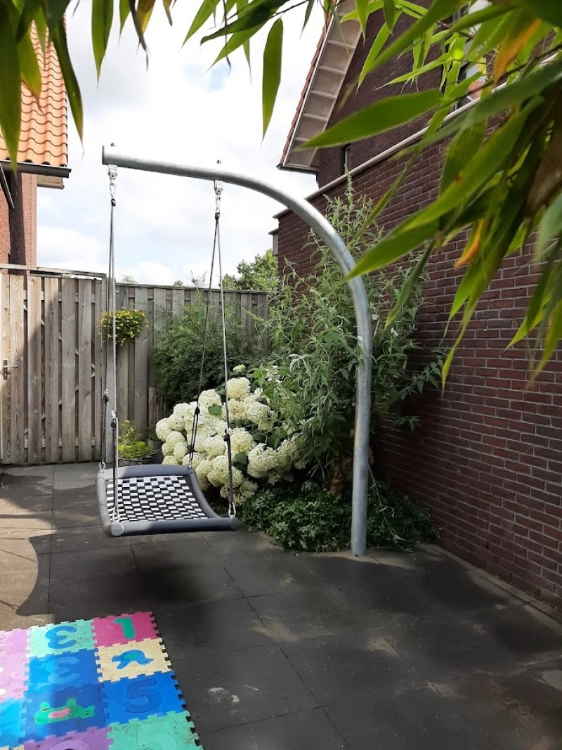 Eigentijds, mooi van vorm en goed te combineren met de nieuwste trends. Neemt weinig ruimte. Bovendien is het een hoge schommel waardoor de oudere kinderen het ook nog leuk vinden om hierin te schommelen. Gemaakt uit gegalvaniseerd staal.