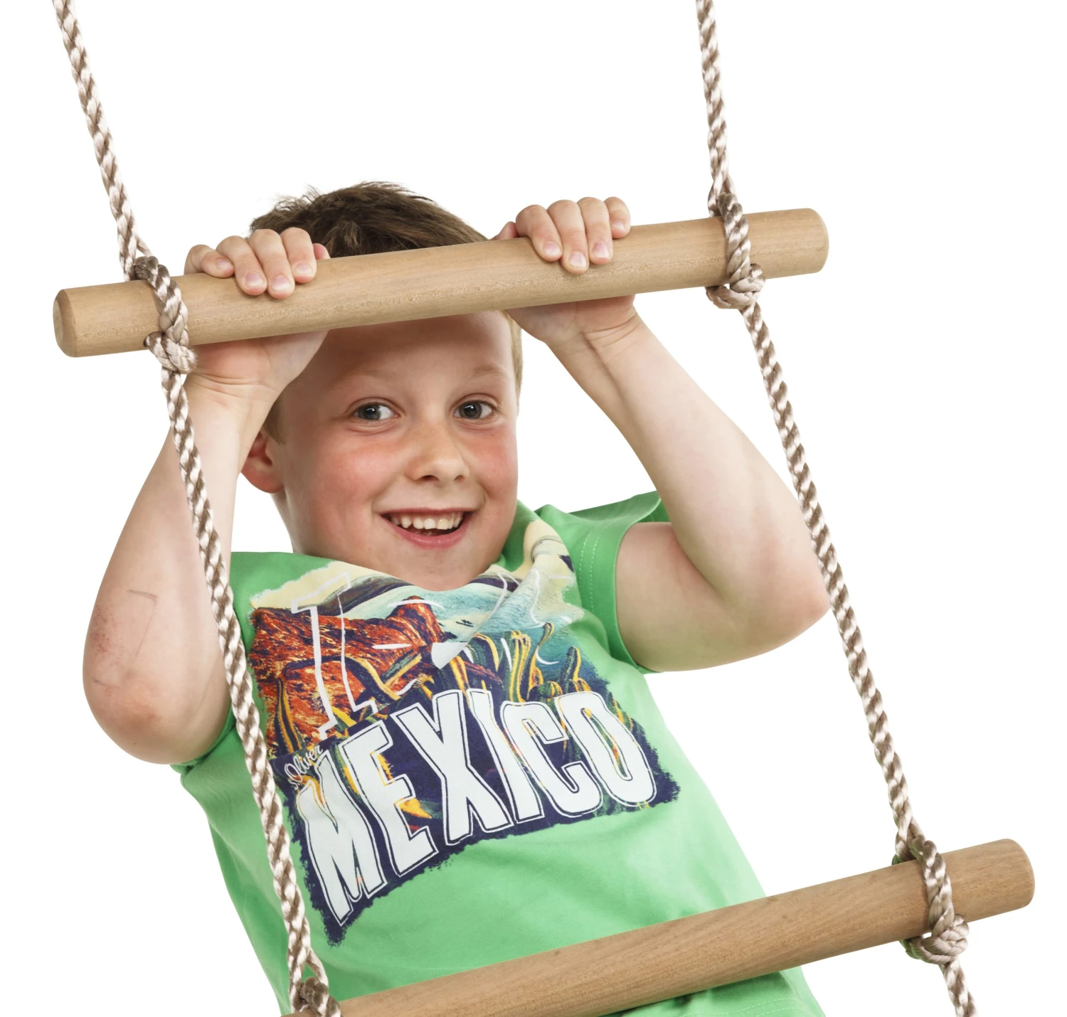 Touwladder met 5 geimpregnerd beukenhouten sporten. Diameter sport 35 mm; lengte sport 400 mm. Polypropyleen touwen diameter 10 mm door-en-rondom de sporten geknoopt. Afstand tussen de sporten 350 mm; de totale lengte is 1,95 m.