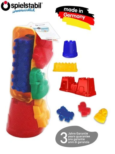 De zandvormen kasteeltoren, kasteelmuur, kasteelpoort , prinses, ridder en paard is er in de drie klassieke kleuren rood, blauw en geel. Hiermee bouw je indrukwekkende zandkastelen of grote forten van zand. De zachte kunststof vereenvoudigt het vormen van het zand en is door zijn elasticiteit ideaal voor het spelen. Daarnaast, is het bestand tegen de meest extreme belasting en kindvriendelijk .
